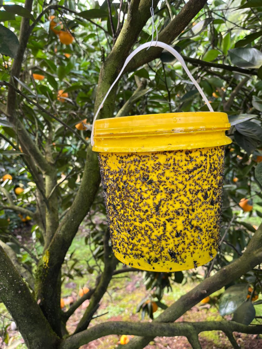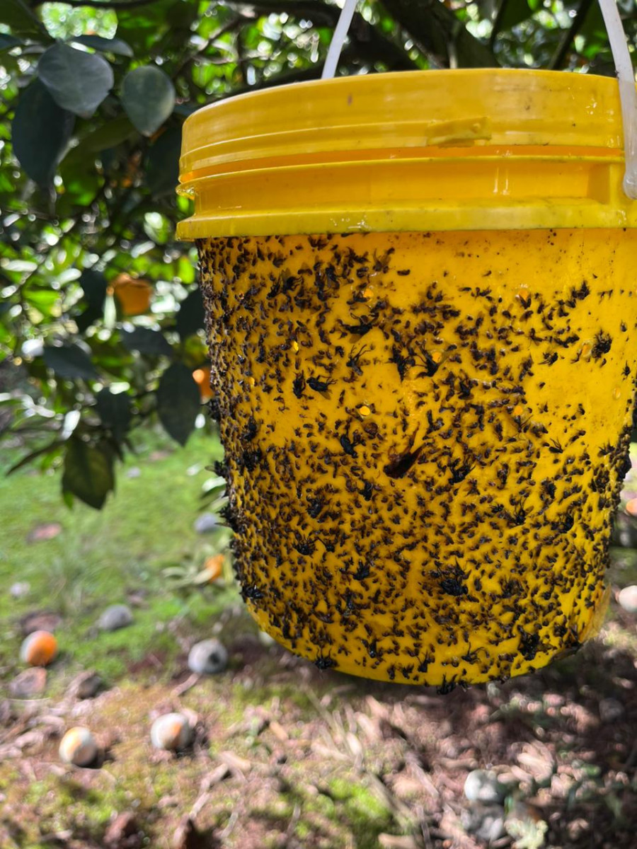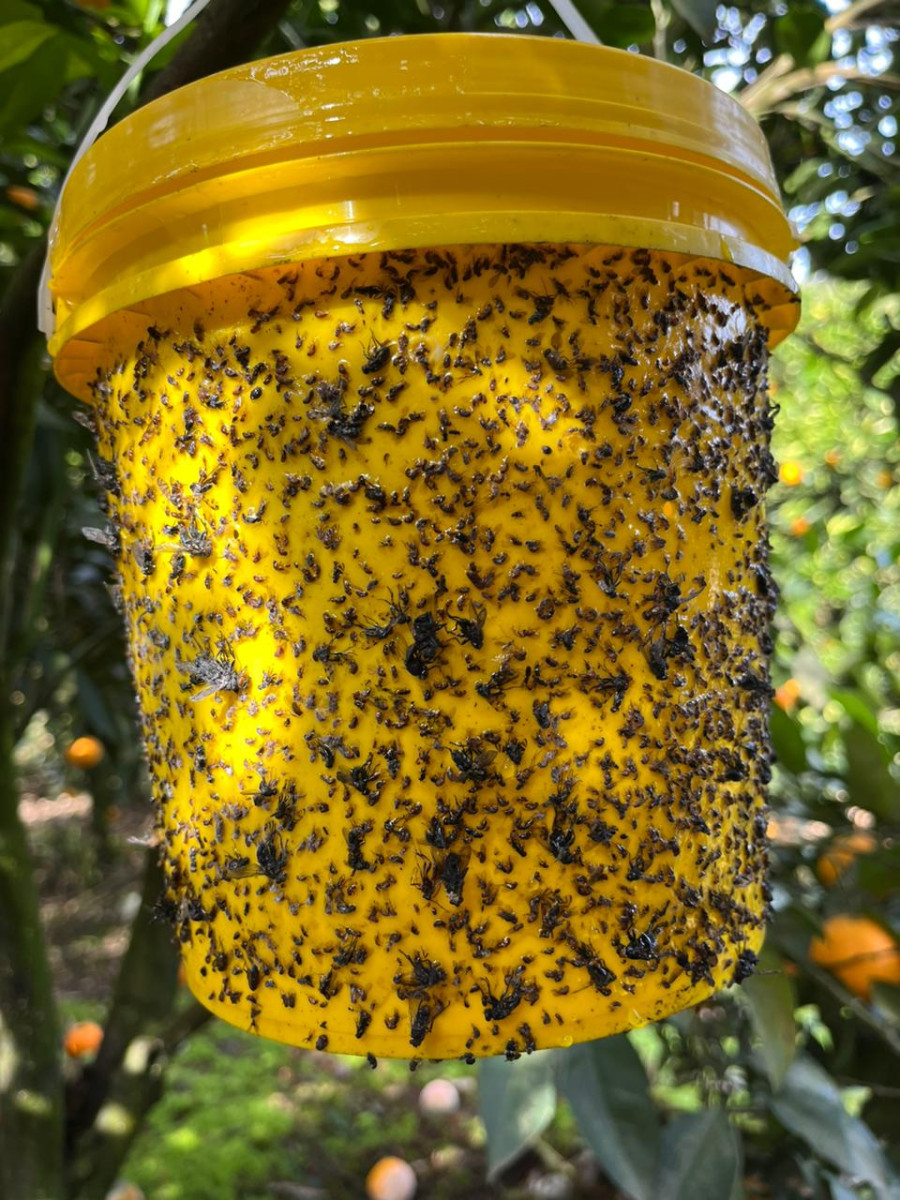 10. Outros atrativos para Mosca da Fruta são: Suco de Laranja a 30%, Suco de Goiaba a 30% + 10% açúcar, Melaço de Cana-de-açúcar a 10%, Vinagre de Vinho, Vinagre de Maçã a 30% + um pouco de açúcar, Suco de Manga a 5%, Suco de Uva a 25%, Melaço de Cana-de-açúcar com Suco de Laranja a 10%. Também podem ser utilizados semioquímicos (feromônios ou aleloquímicos). Solicite ficha da FORMIFUU® com sugestões de atrativos utilizados em vários cultivos.